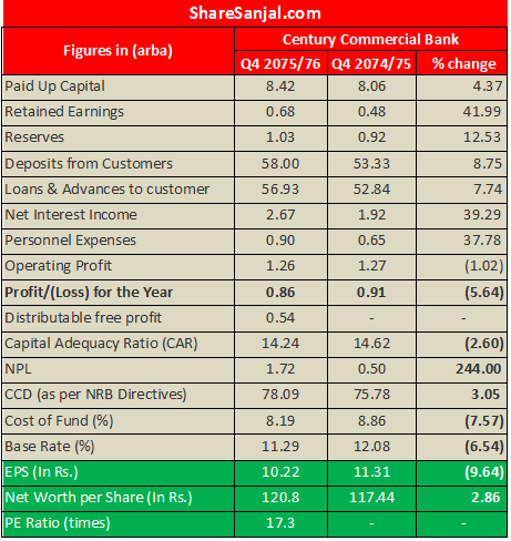 Century Bank has published Fourth quarter report of FY 2075/76. It has reported fall in net profit by 5.64% in the comparing period.
