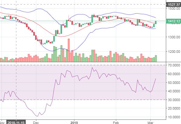 14 days RSI at 54, 5 days & 20 days moving average is below current index of 1412 points.
