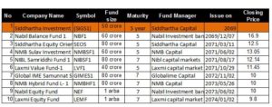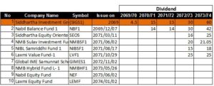 Siddhartha Growth schemes-1, first mutual fund is matured this year. It has provided, 4.5, 15, 15, 30, 60 resp. year. Nabil Balance fund provided 14% in the first year. Likewise, Siddhartha equity provided 16%, NMB Sulav investment provided 20%, NIBL Samriddhi fund 15%, Laxmi fund provided 25%. Other fund haven’t provided any dividend yet.