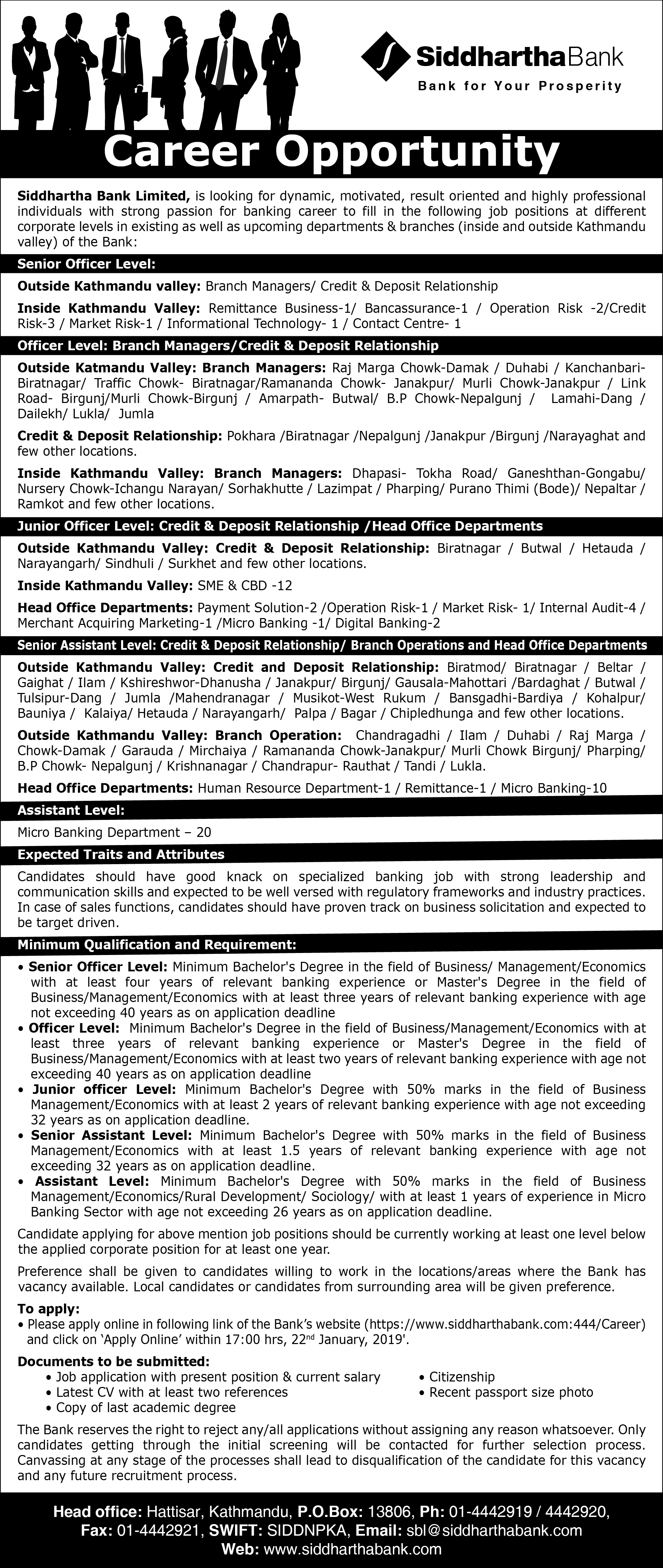 Visit www.siddharthabank.com:444/career to apply job. Click here: Apply Online within 17:00 hrs, 22 January 2019