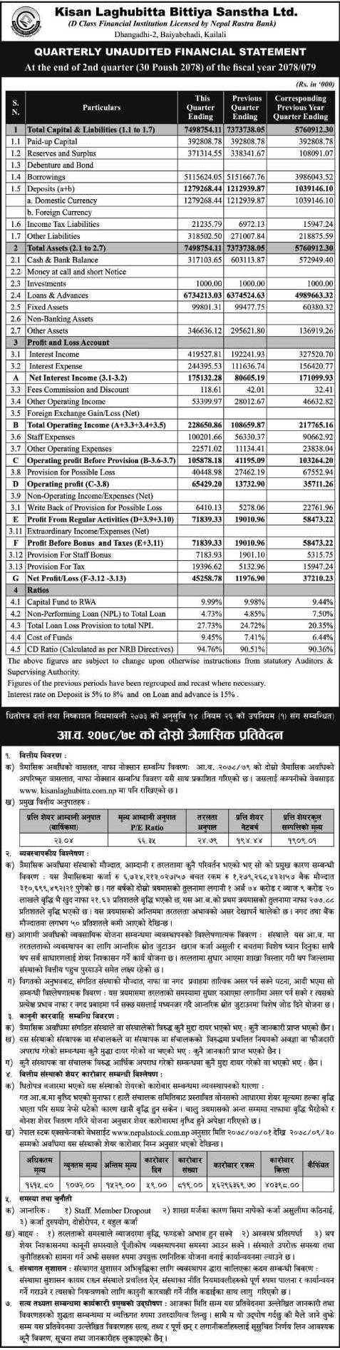 Kisan Laghubitta Bittiya Sanstha Limited has posted net profit of Rs.4.52 crore in second quarter of fiscal year 2078-79.