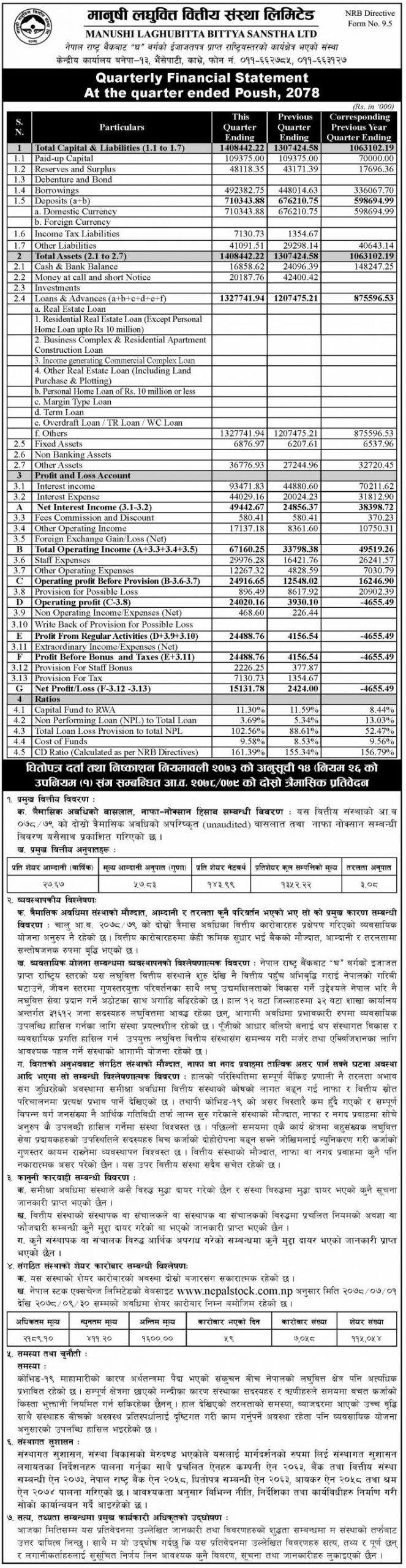 Manushi Laghubitta Bittiya Sanstha has published second quarter report of fiscal year 2078-79.