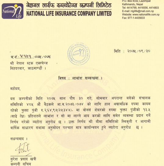 National life Insurance Company has announced 13.5% dividend for shareholders.