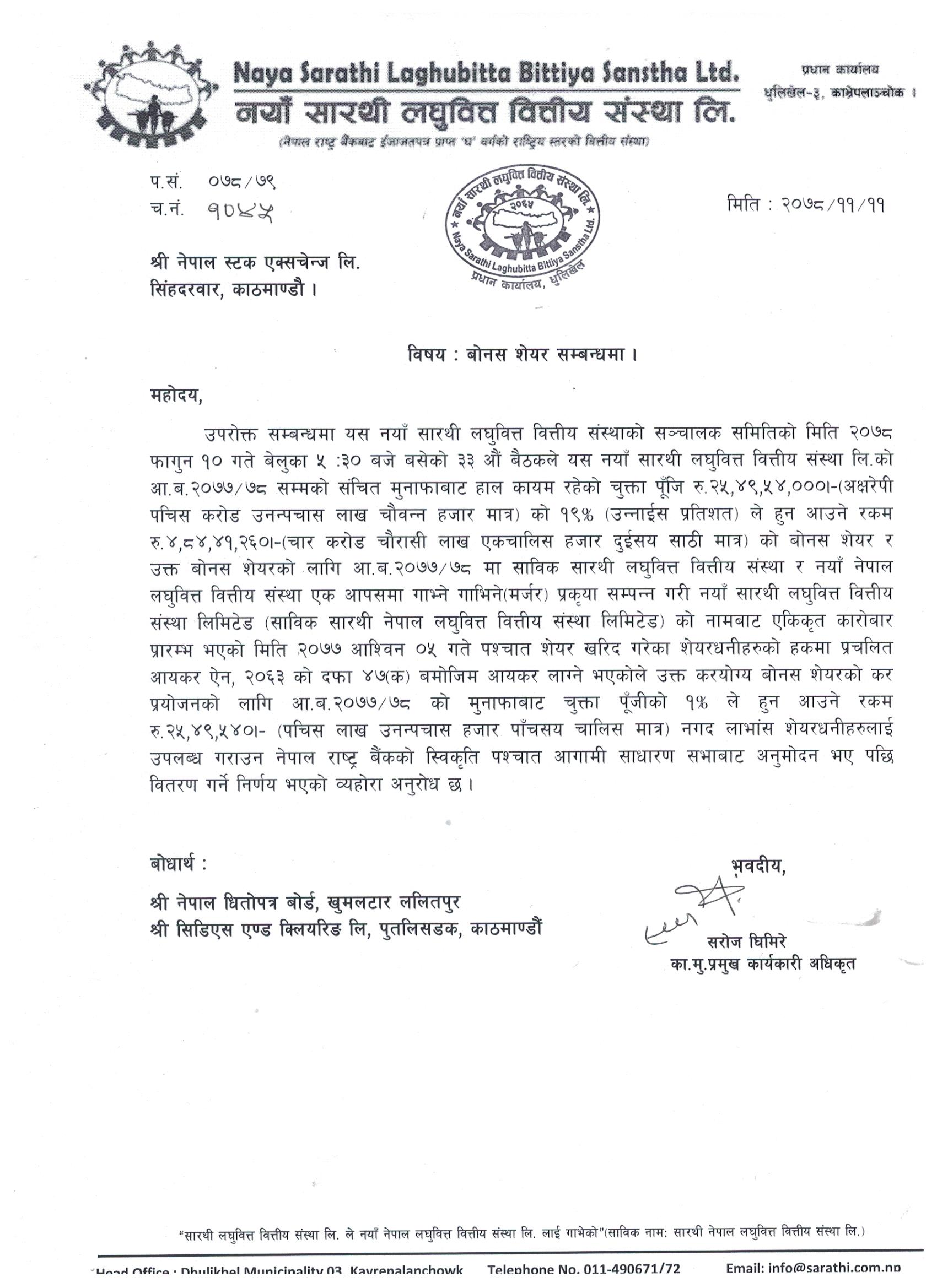Naya Sarathi Laghubitta Bittiya Sanastha limited has proposed bonus share and cash dividend for its shareholders from income of Fiscal year 2077-78.