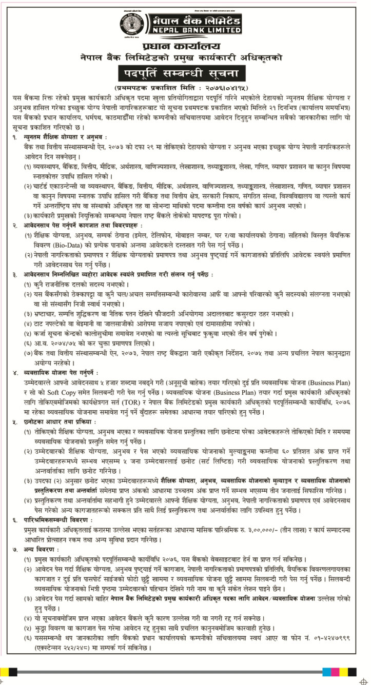 Nepal Bank has announced vacancy for CEO (chief executive officer). It is government owned commercial bank of Nepal. Qualified applicants an apply for the post within 21 days from today, 15 Shrawan 2076.