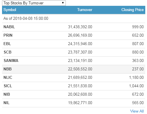Top turnover of day is Nabil bank with turnover of 3.14 crore followed by Prabhu insurance by 2.66 crore, Everest bank by 2.43 crore, Standard chartered bank by 2.37 crore, sanima bank by 2.31 crore, etc.