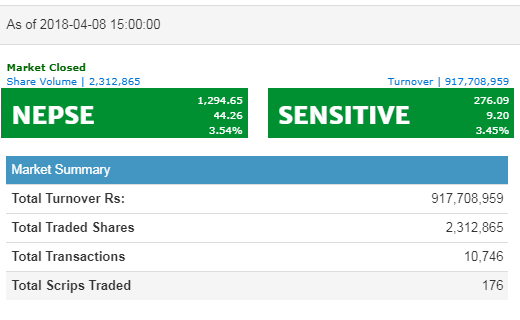 The NEPSE index rose by 44.26 points  & closed at 1294.65 points with turnover of 91.77 crore. All the sub-index also closed in green. Total 176 stock were traded.