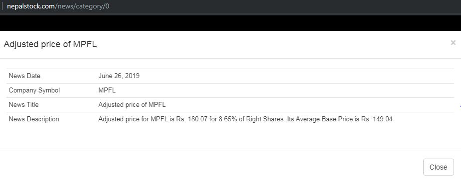 Nepal stock exchange (Nepse) has adjusted stock price of Multipurpose Finance Company Limited for right issue.