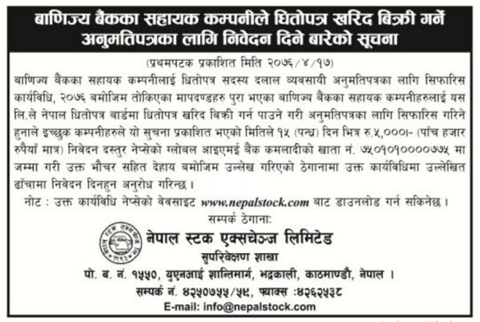 Those banks that have fulfilled all necessary criteria for brokerage licence are urged to submit application along with Rs. 5000 within 15 days from today. Fees must be deposit at Global IME Bank A/C 7502020000775 in name of Nepal Stock exchange.