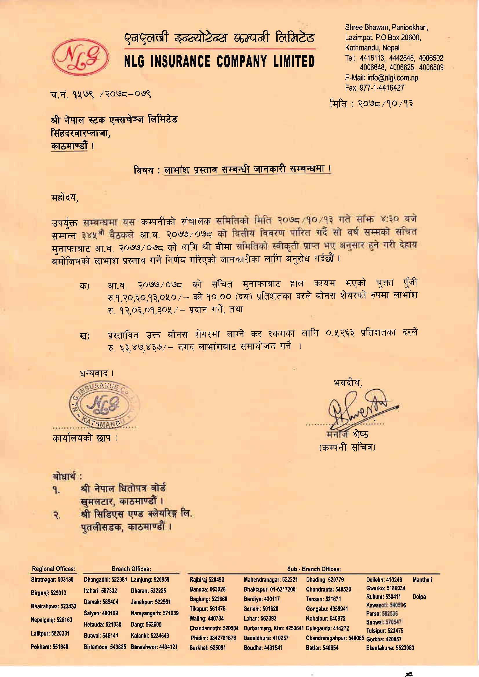 NLG Insurance company Limited has proposed dividend for its shareholders from income of FY 2077-78. Its has proposed 10 percent bonus share and 0.5263 percent cash dividend for tax purpose.