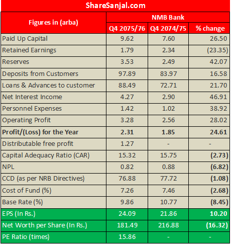 NMB Bank has published Fourth quarter report of FY 2075/76. It has reported increase in net profit by 24.61% in the comparing period.