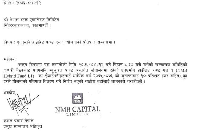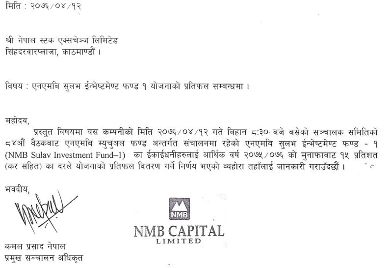 The board meeting of the NMB Capital held today 8:30 has decided to distribute 15% dividend including dividend tax for unit holders of NMB Sulva Investment -1 and 10% dividend for unit holders of NMB Hybrid Fund L1 including tax.