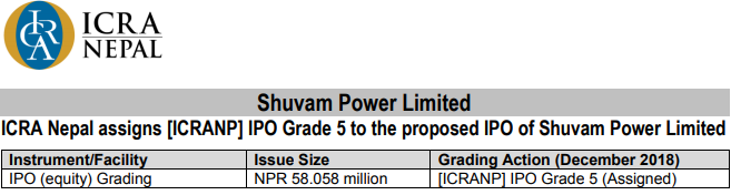 ICRA Nepal has assigned “[ICRANP] IPO Grade 5”, indicating poor fundamentals to the proposed initial public offering (IPO) of Shuvam Power Limited (SPL). Grade 1 indicating strong fundamentals and Grade 5 indicating poor fundamentals.