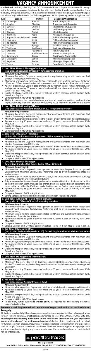 Prabhu Bank announces job vacancies for various employees & locations. The bank is seeking applications from highly energetic, dynamic, self motivated and result oriented eligible competent Nepali citizens for following positions.
