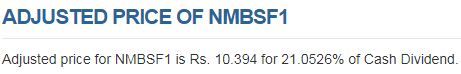 Accordingly, price of NMBSF1 is adjusted. Last trading price before book close was Rs. 12.50. As per rule, 21.0526% Cash dividend on par Rs. 10 will be Rs. 2.10526 and 10% of market price Rs. 12.50 is Rs.1.25 Here, Cash dividend on Par value is greater than 10% of market value so price adjustment is made as per rule of bonus share adjustment.