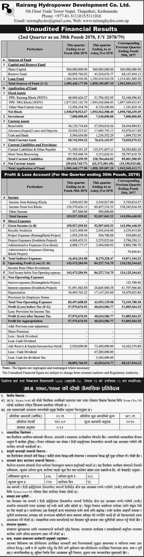 Rairang Hydropower Development Company Limited has posted increased in net profit in second quarter of fiscal year 2078-79