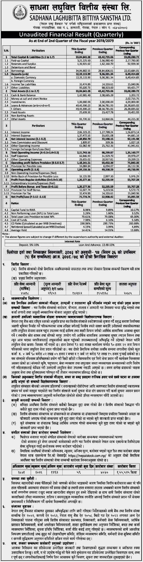 Sadhana Laghubitta has reported net profit of Rs. 7.57 crore in Q2 of FY 2078-79