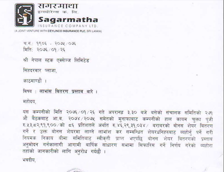 Sagarmatha Insurance company has announced dividend for shareholders from the income of FY2074/75.