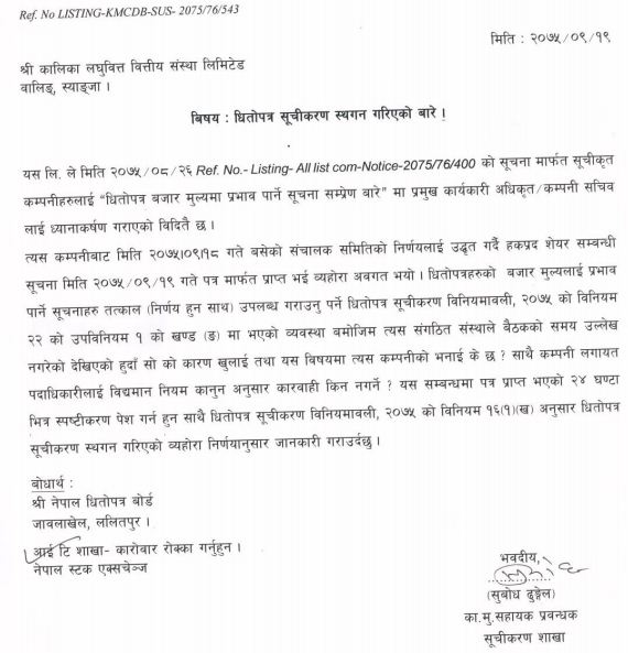 Nepse has suspended the trading of Kalika Laghubitta Bittiya Sanstha.