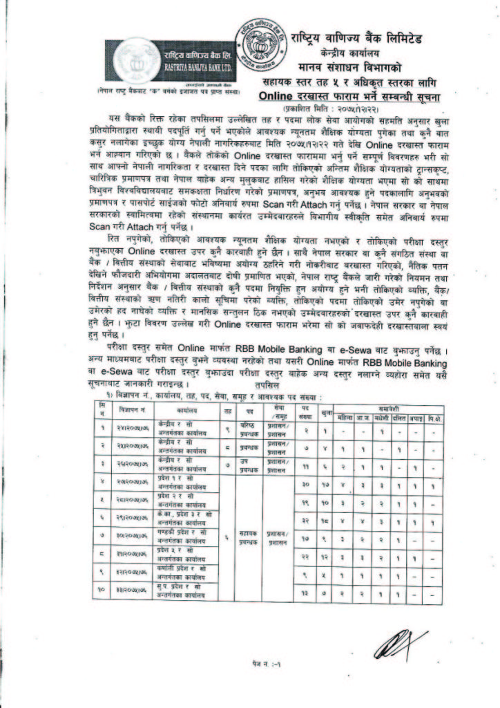 Rastriya Banijya Bank announces job vacancy for various positions. It fully government owned commercial bank of Nepal seeking application from qualified Nepalese citizens.